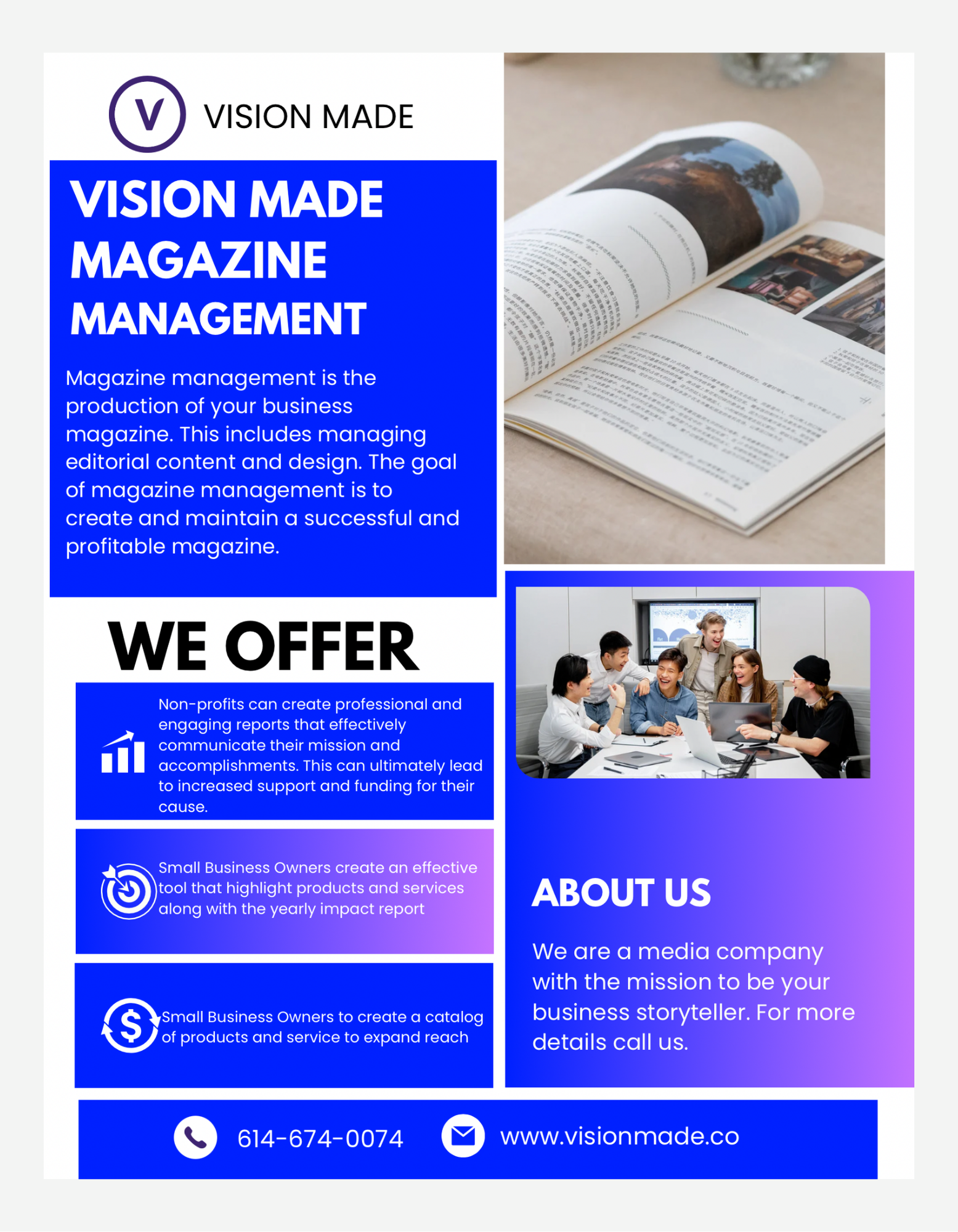 - Print & Digital Ads – Full page, half page, quarter page ad placements inside Vision Made Magazine.